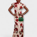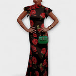 Tyto ohromující maxi šaty jsou vyrobeny z elastického materiálu a mají jedinečný potisk růží, který dodává eleganci při každé příležitosti. Díky klasickému mandarinovému límečku a kontrastnímu lemování jsou tyto šaty navrženy tak, aby udělaly dojem.