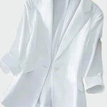 Elegantní sako s nadčasovým střihem a moderním designem. Má klopu, přední zapínání na jeden knoflík a dlouhé rukávy se zdobnými knoflíky na konci. Jeho rovný střih ho činí ideálním jak pro pracovní příležitosti, tak pro volnější chvíle. Kousek, který dodává styl a šarm každému outfitu.