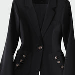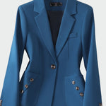 Impozantní sako s ženským střihem, které vyniká elegantními detaily. Jedno tlačítko na přední straně dodává minimalistickou eleganci, zatímco dekorativní knoflíky na kapsách přinášejí moderní nádech. Ideální pro pracovní schůzky, ale také pro večerní výstupy se stylem.