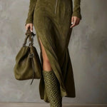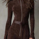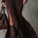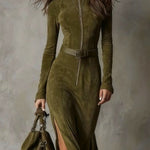 Dlouhé semišové šaty Alessia spojují charakter western-chic vzhledu s ženskou linií, která prodlužuje a zvýrazňuje postavu. Materiál s efektem semiše je měkký, ale strukturovaný, zatímco přední zip a pásek v pase tvarují pas. Boční rozparek dodává pohyb při každém kroku, aniž by byl příliš výrazný.