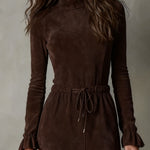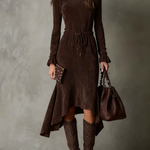 Midi šaty z semiše Isla spojují měkkost syntetického semiše s rafinovanou a ženskou siluetou. Poloviční vysoký límec, měkké rukávy a opasek v pase vytvářejí siluetu, aniž by se stáhly, zatímco asymetrický lem dodává pohyb každému kroku. Perfektní na večerní vycházky, speciální akce nebo pečlivější okamžiky během dne.