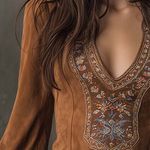 Mini šaty z imitace semiše s výšivkou fialové spojují jemnost imitace semiše s delikátními květinovými výšivkami na výstřihu a rukávech, pro ženský a jedinečný vzhled. Výstřih do V opticky prodlužuje postavu, dlouhé nabírané rukávy vyvažují siluetu a mini délka dodává charakter, aniž by byla přehnaná – ideální od odpoledne do večera, jak v modré, tak v teplejších odstínech.