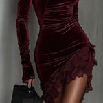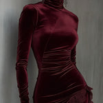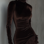 Mini šaty z sametu Chiara kombinují ženský, přiléhavý střih s jemnými krajkovými detaily pro romantický a sofistikovaný vzhled. Vysoký límec a dlouhé rukávy vyvažují krátkou délku, čímž vytvářejí moderní eleganci ideální pro večeře, večírky a večerní akce.