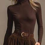 Měkké a pohodlné materiály – Elastický rolák, který jemně obepíná tělo, a strukturovaná, ale lehká sukně, příjemná na nošení po celý den.