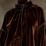 Mini šaty z sametu Valentina obepínají postavu v měkkém a lesklém materiálu, zatímco vysoký límec s mašlí a lanternové rukávy vytvářejí rafinovaný, ale rozhodný vzhled. Mírně volný střih splývá po těle, aniž by se obepínal, takže se cítíte pohodlně a pečlivě po celou noc.