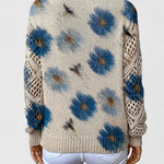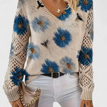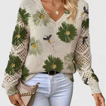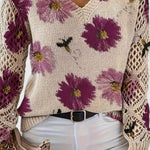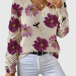 Tento jemný pletený kardigan s fialovými a levandulovými květinami dodává každému outfitu subtilní, ženský nádech. Vzdušné rukávy poskytují zakrytí paží, aniž byste museli slevit z pohodlí, a jemný V-výstřih ho činí ideálním pro kombinaci s náhrdelníkem nebo šálou.