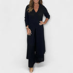 • Moderní styl: Dlouhá tunika s elegantním rozparkem a volným střihem, doplněná o šité kalhoty.