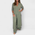 Vylepšete svůj šatník tímto chic 3-dílným stylovým dámským setem, který se skládá z dlouhé tuniky a odpovídajících kalhot. Tento set je navržen pro uvolněný vzhled a eleganci, vhodný jak na neformální výlety, tak na více rafinované příležitosti.