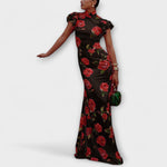 Tyto ohromující maxi šaty jsou vyrobeny z elastického materiálu a mají jedinečný potisk růží, který dodává eleganci při každé příležitosti. Díky klasickému mandarinovému límečku a kontrastnímu lemování jsou tyto šaty navrženy tak, aby udělaly dojem.