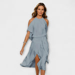 Objevte šaty Madonna, ztělesnění bez námahy elegance. Tyto asymetrické midi šaty s odhalenými rameny vyzařují grácii díky svému splývavému materiálu, který se s každým krokem pohybuje elegantně. Sofistikovaný design s halter výstřihem z nich dělá nezbytný kousek ve vašem šatníku.