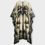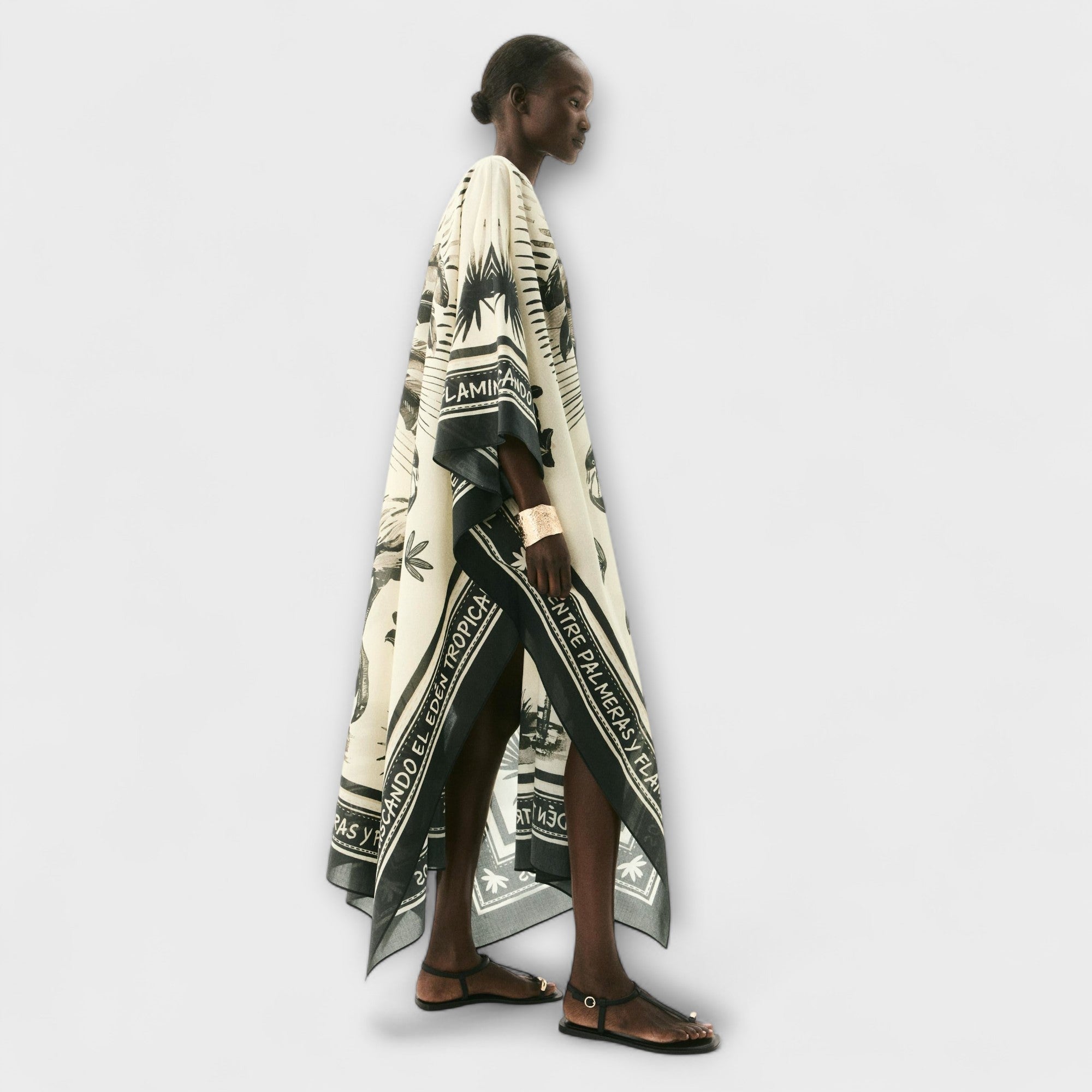 Dodajte svému prázdninovému stylu nádech elegance s naším oversized kaftanem s potiskem plameňáka, navrženým pro bezstarostnou eleganci a pohodlí. Tento ohromující kousek má hravý potisk plameňáka a palmy na chic světle béžovém a černém podkladu.