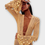 Pozvedněte svůj styl s našimi úchvatnými zlatými pletenými šaty, navrženými tak, aby vás oslnily při každé příležitosti. S hlubokým V-výstřihem a rozšířenými rukávy kombinují tyto šaty eleganci s nádechem zábavy díky hravým detailům s flitry.