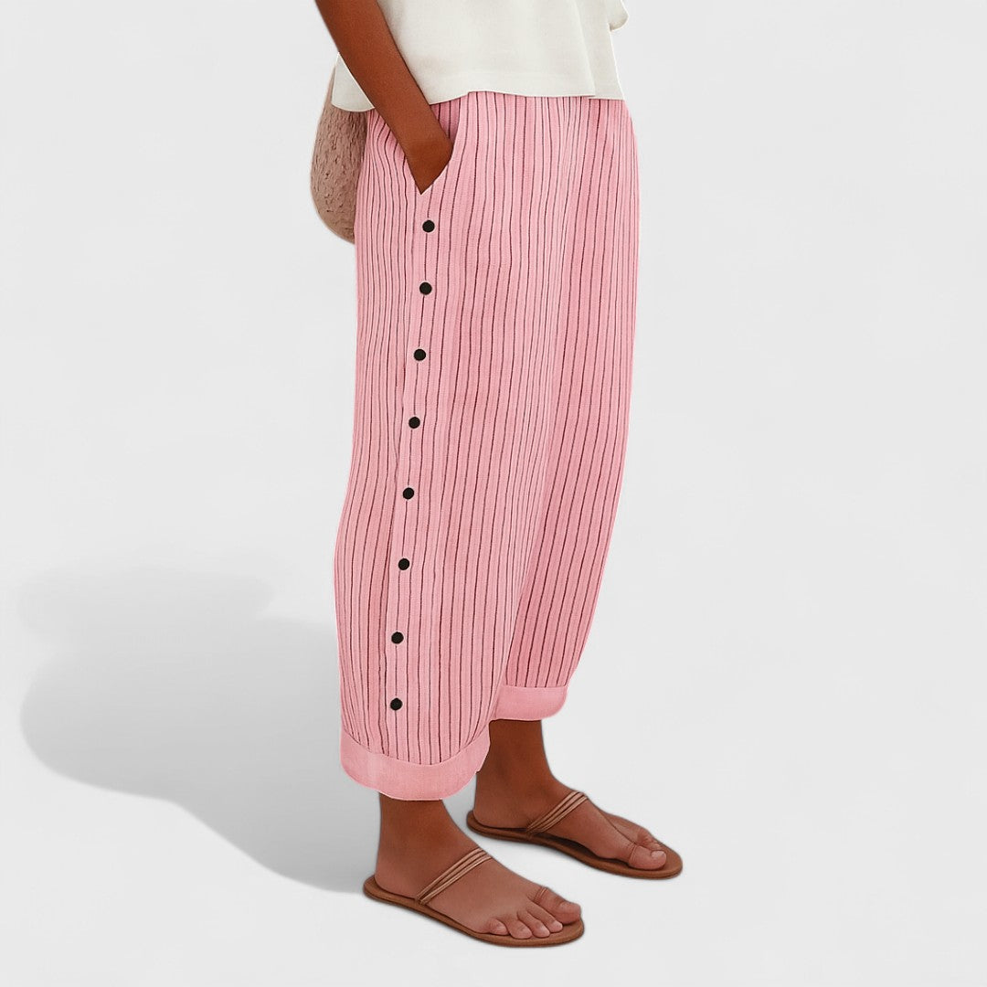 Kalhoty Věra jsou vyrobené z jemného lnu, který přirozeně chladí a dýchá. Díky volnému střihu a elastickému pasu nabízejí pohodlí, ale zároveň vypadají upraveně – ideální na procházky, večerní setkání nebo dny, kdy chcete vypadat stylově a zároveň se cítit dobře.